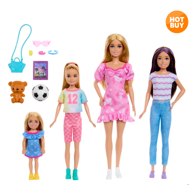セットにはバービー、スキッパー、ステイシー、チェルシーの4人のドールが勢ぞろい。バービーはピンクのドレスにバッグをコーディネート。テイシーはカジュアルなトップスとジーンズにタブレットを持っています。スキッパーは、アクティブに遊べるスポーツウェアとサッカーボールを、そして、一番年下のチェルシーは、青いワンピースを着てテディベアを抱えます。対象年齢 3 箱寸法(幅x高さx奥行 cm) 40 x 33 x 6 組立 不要 電池使用 いいえ 重量 0.7kg